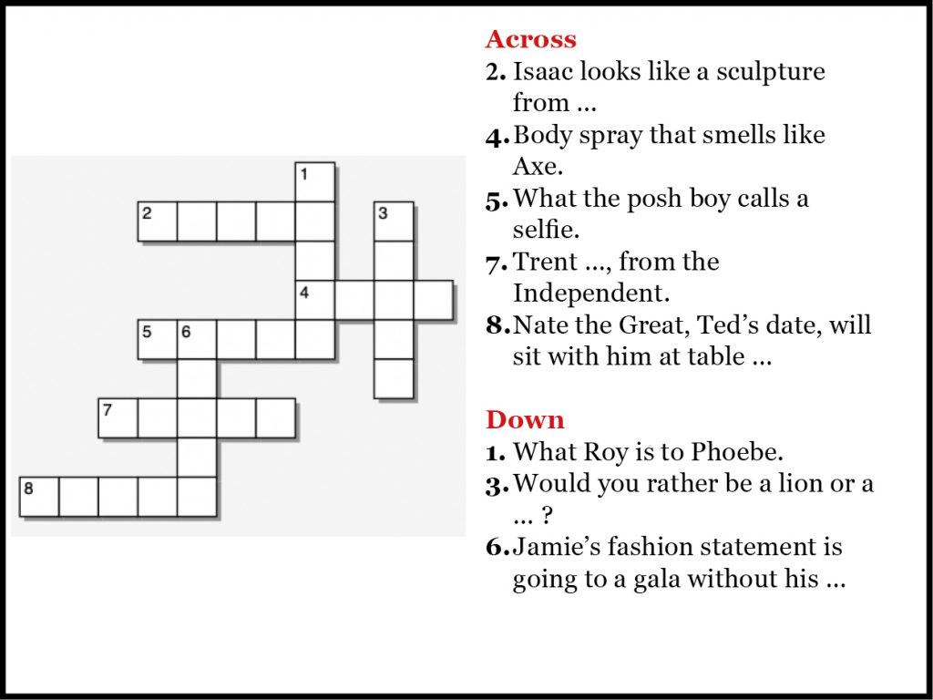 What could be done, and what would be quite enjoyable, was crisscross puzzles. So Rebecca started building crisscross puzzles from her copious notes on each episode, using commercial educational software from the Web.